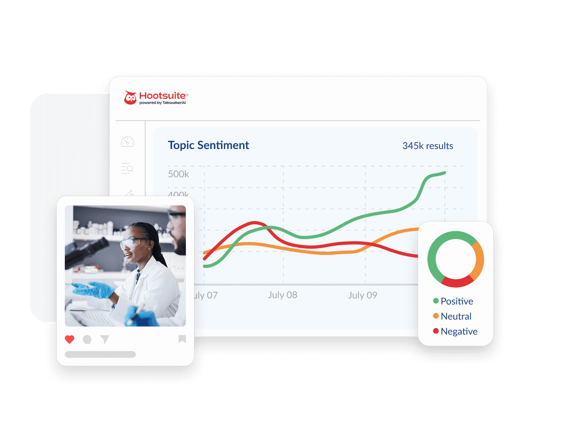 Corporate reputation management is the practice of monitoring and influencing how the public, customers, investors, and employees perceive your brand. Hootsuite powered by Talkwalker AI helps by providing real-time media monitoring, sentiment analysis, and issue detection across all channels — so you can protect your corporate image and respond quickly to emerging risks.