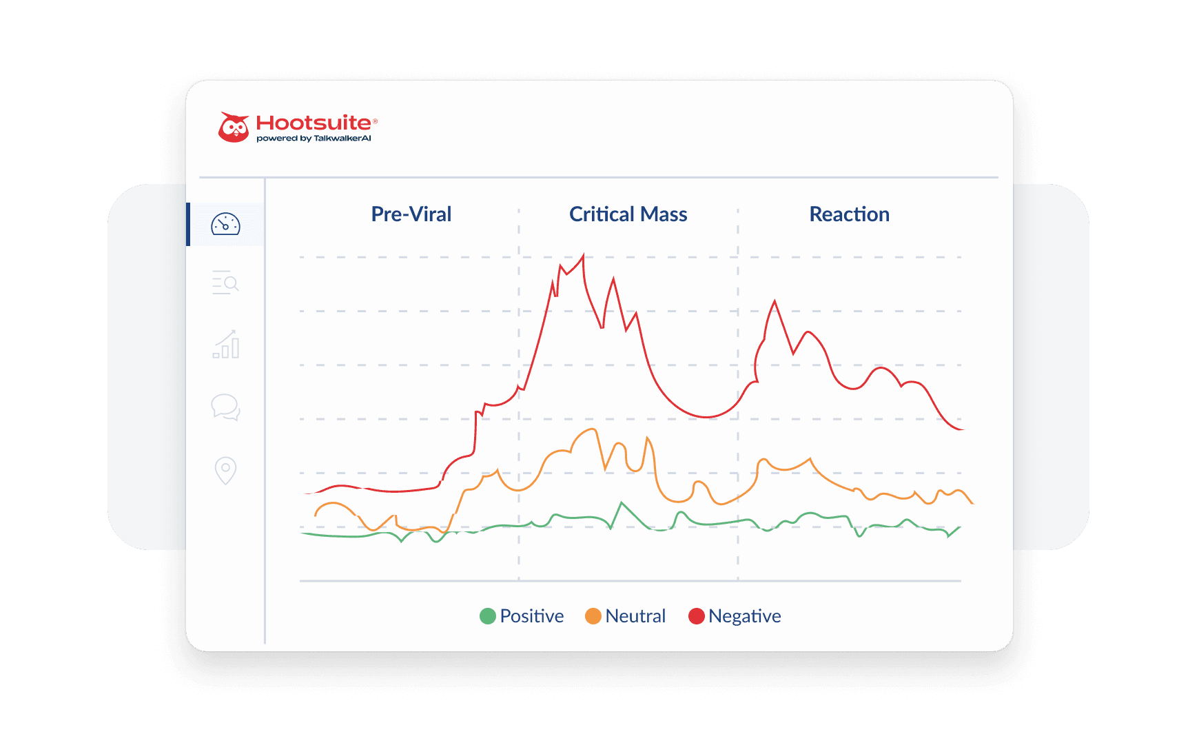 Hootsuite analytics graph showing sentiment trends across three phases: Pre-Viral, Critical Mass, and Reaction, with positive, neutral, and negative indicators