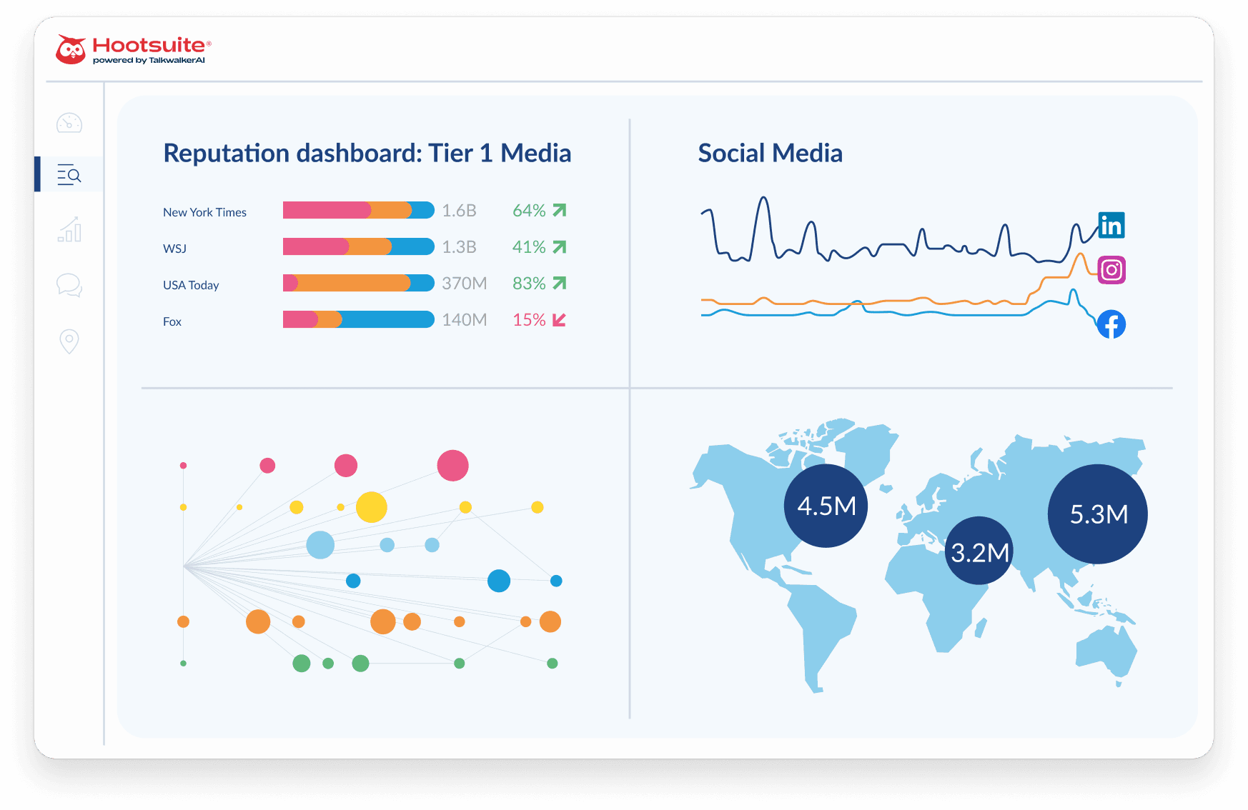Hootsuite reputation dashboard showing media performance metrics and global reach map with social media trend lines and engagement statistics