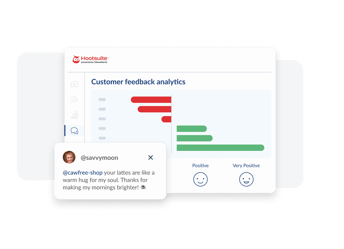 Hootsuite customer feedback analytics dashboard showing sentiment analysis with red and green bars and a positive social media comment about coffee